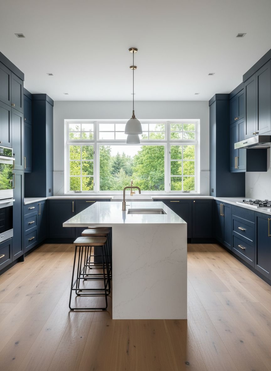 Sometimes, the best design move is to commit fully. Painting every cabinet—uppers, lowers, and island—in a rich navy blue creates a moody, immersive experience. This “color drenching” technique is perfect for medium-to-large kitchens with good natural light. It wraps the room in color, creating a cozy, cocoon-like atmosphere that is perfect for intimate dinner parties.
