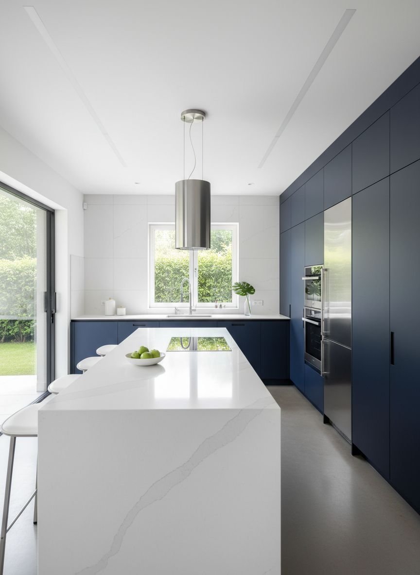 To prevent the room from feeling like a cave, the countertop choice is crucial. A solid white quartz or a very light grey concrete is essential to bounce light around the room. Additionally, keeping the walls and ceiling a bright, clean white ensures the navy remains the star of the show rather than an overwhelming force.