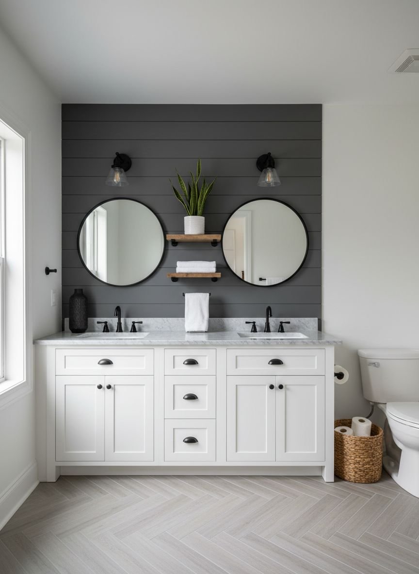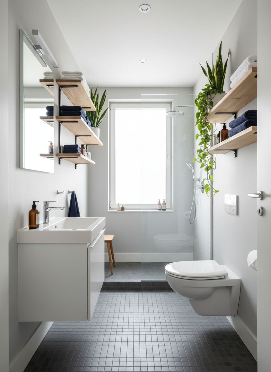 You must keep open shelves tidy for this to work. Use attractive baskets or glass jars to organize smaller items. Roll towels neatly to create a spa vibe. Do not overstuff the shelves. Leave some negative space between items. This breathing room is essential for the spacious effect. Open shelving forces you to remain organized and prevents the accumulation of unused products.