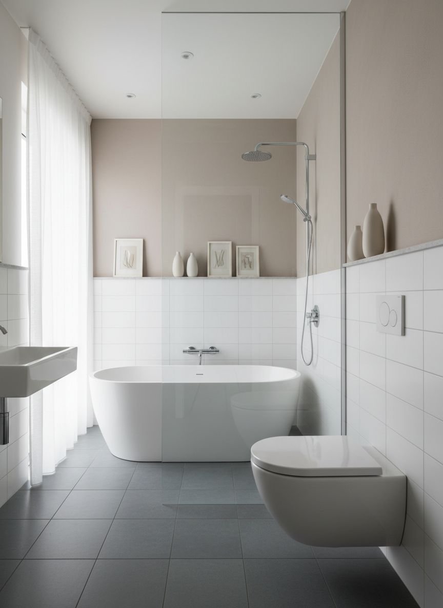 • Large Format Tile: 12×24 inch tiles in marble or concrete look.