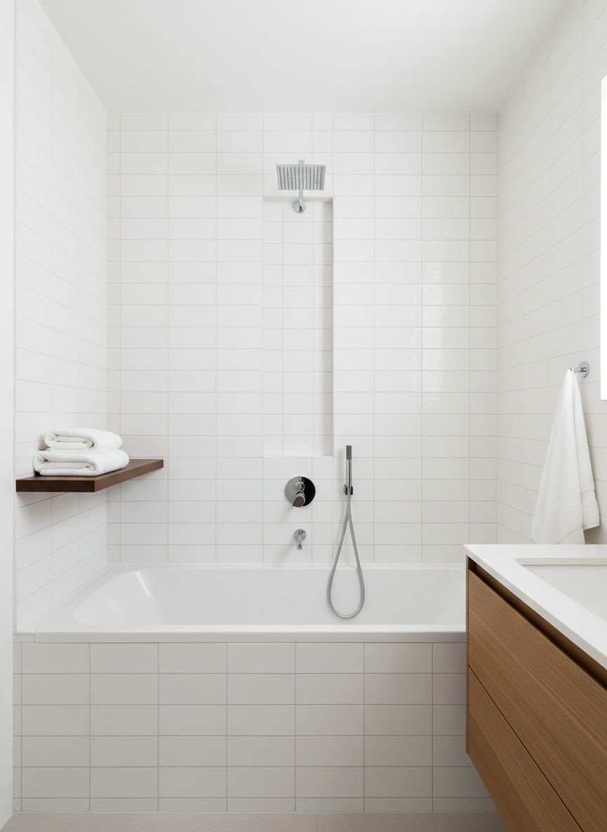 Lay rectangular tiles horizontally to make the room look wider. Lay them vertically to make the ceiling look higher. Match the grout color to the tile color. High contrast grout highlights the grid and chops up the space. Low contrast grout blends the tiles together. Continue the floor tile into the shower to create a seamless look. This unity prevents the floor plan from being visually divided into small zones.