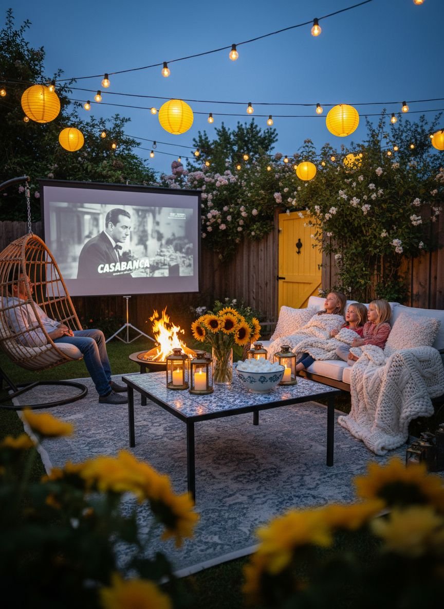 To make this function well, mount your projector on a stable, low table or a dedicated DIY stand that hides the cords. Surround the viewing area with dimmable lanterns or solar path lights that define the perimeter without washing out the picture. The texture of the fabric screen against natural wood supports creates a rustic, inviting look even when the movie isn’t playing.