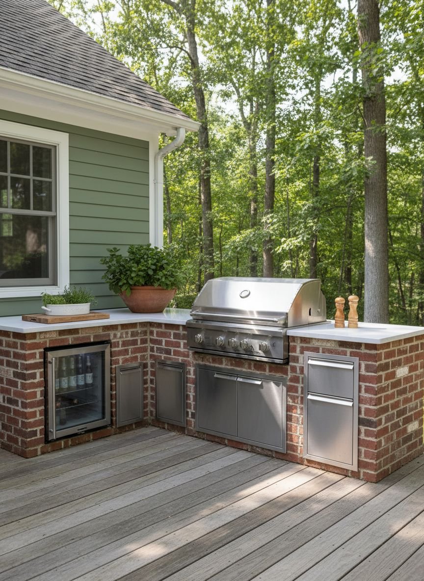 The visual weight of a built-in grill anchors your patio layout. It creates a designated “zone” for cooking, separating it from the lounging areas. Adding a stainless steel access door (even a faux one) into the base adds professional polish and breaks up the stone or stucco surface. Top it with a concrete countertop or slate tiles to provide essential prep space that a standard grill lacks.