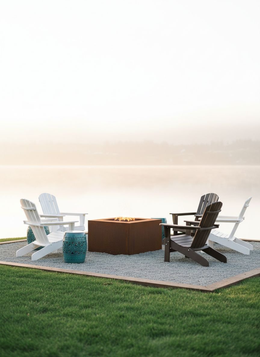 The contrast between the grey or tan gravel and the green lawn creates a clean, architectural line that looks professionally landscaped. Center a metal fire ring or build a stone kit in the middle. The furniture placement is crucial here; arrange Adirondack chairs in a tight circle to encourage conversation. The gravel acts as a neutral base that makes the wood tones of the chairs pop.