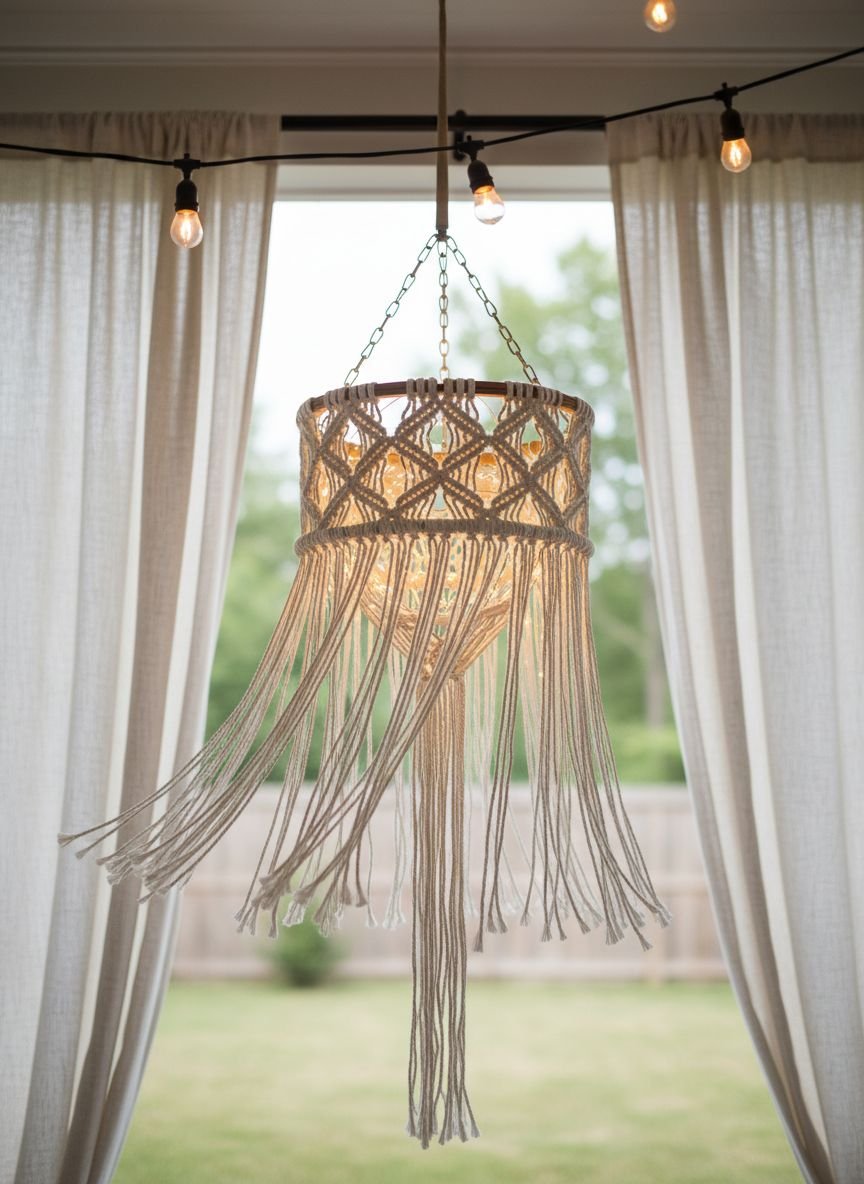 At night, this chandelier looks like a floating cloud of fireflies. It works perfectly hung over a dining table or a lounge area. The texture is soft and intricate, contrasting beautifully with hard patio furniture. It brings the “boho glam” aesthetic directly to your backyard for the cost of a few craft supplies.