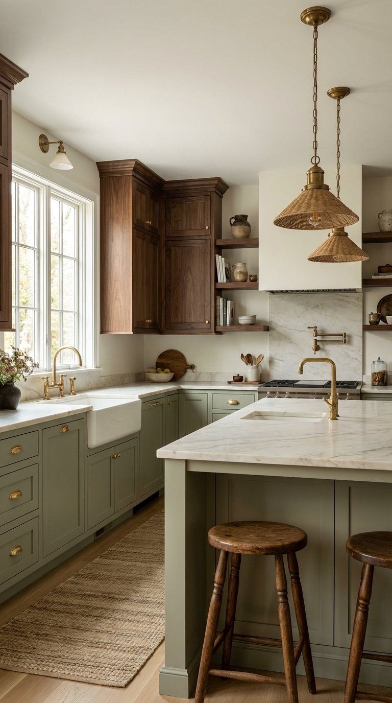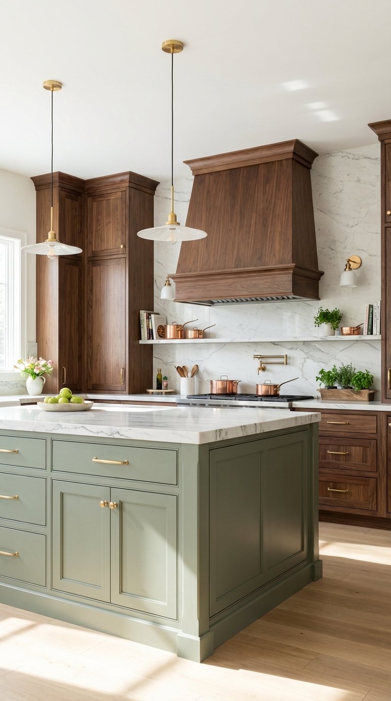 Sage green has solidified itself as the “new neutral” in interior design. When you pair soft, muted sage cabinetry with the deep, chocolate tones of rich walnut wood, you create a kitchen that feels instantly luxurious yet approachable. The visual analysis here is all about contrast in saturation; the pale, dusty green allows the intricate grain of the walnut to take center stage without competing for attention.