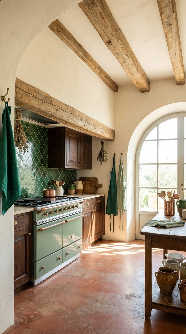 Pro Tip: Add terracotta floor tiles to complete the Mediterranean triad of colors (Green, Wood/Red, Terracotta/Orange).