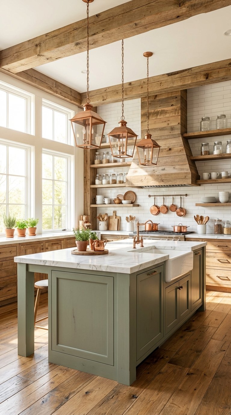The visual success of this design comes from the “rough meets smooth” texture clash. The sleek, painted finish of the forest green island contrasts beautifully with the knots, nail holes, and imperfections of reclaimed wood beams or floating shelves. This is a perfect implementation of sustainable design, reusing materials to add soul to a new space.