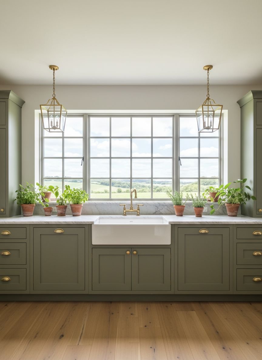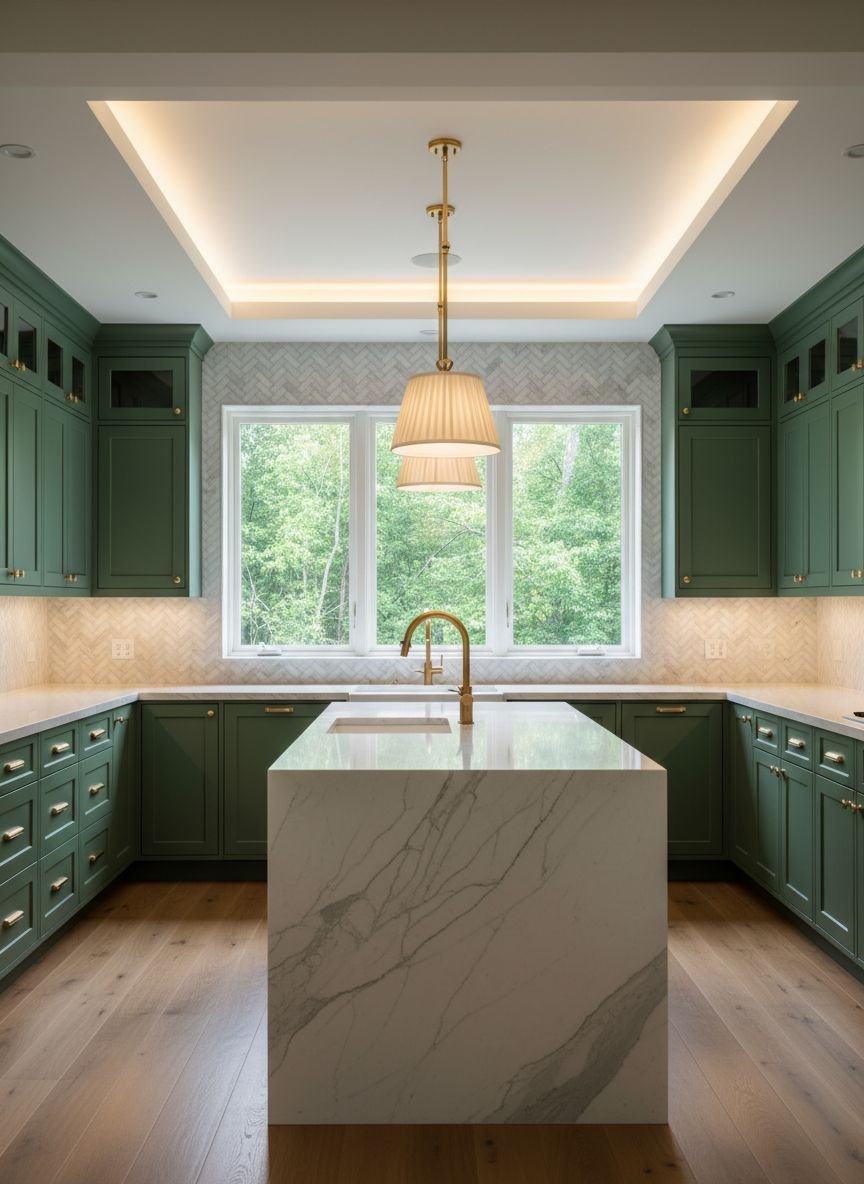 Pro Tip: Use handmade Zellige tiles for the backsplash. Their uneven surface reflects light like water, adding movement to the moss green color.