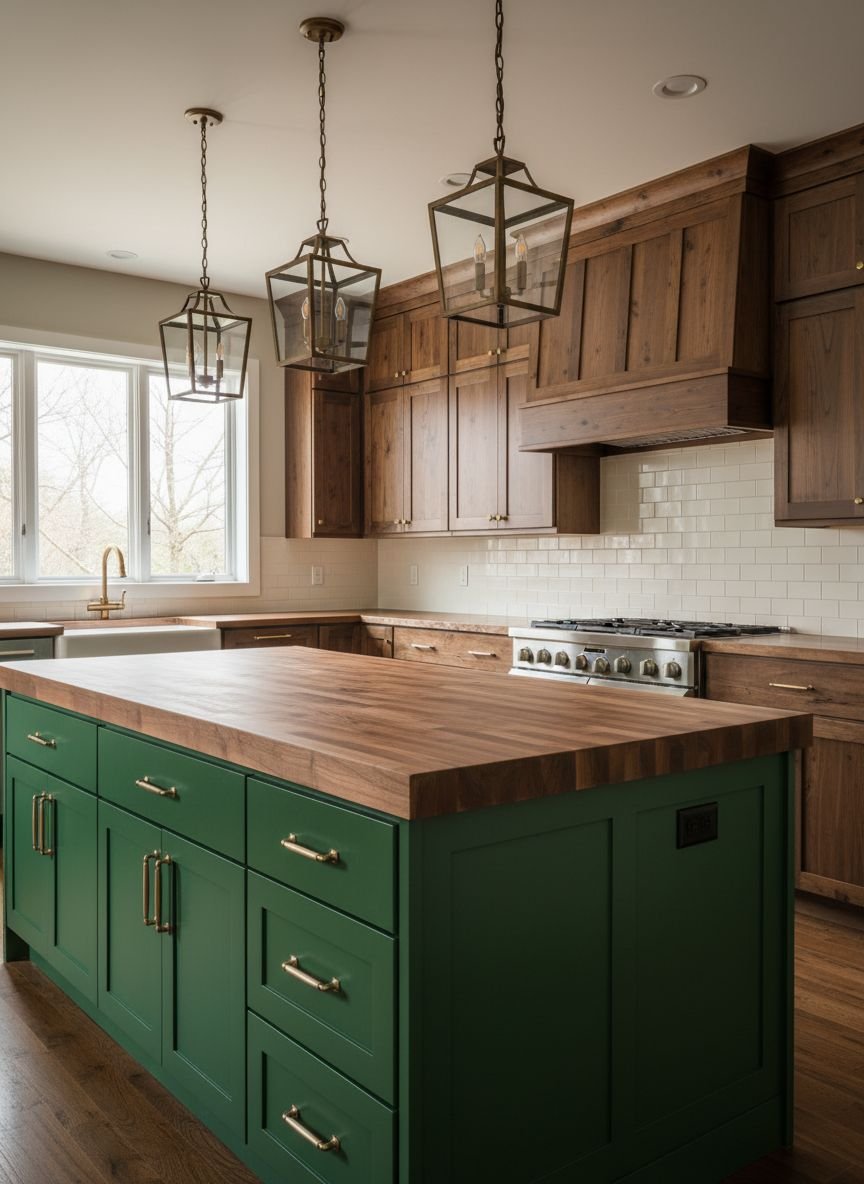 For those who love the drama of a farmhouse aesthetic, a forest green kitchen island serves as a stunning focal point. Forest green is a deep, intellectual color that commands attention. Pairing it with rough-hewn, reclaimed wood details creates a narrative of history and sustainability.