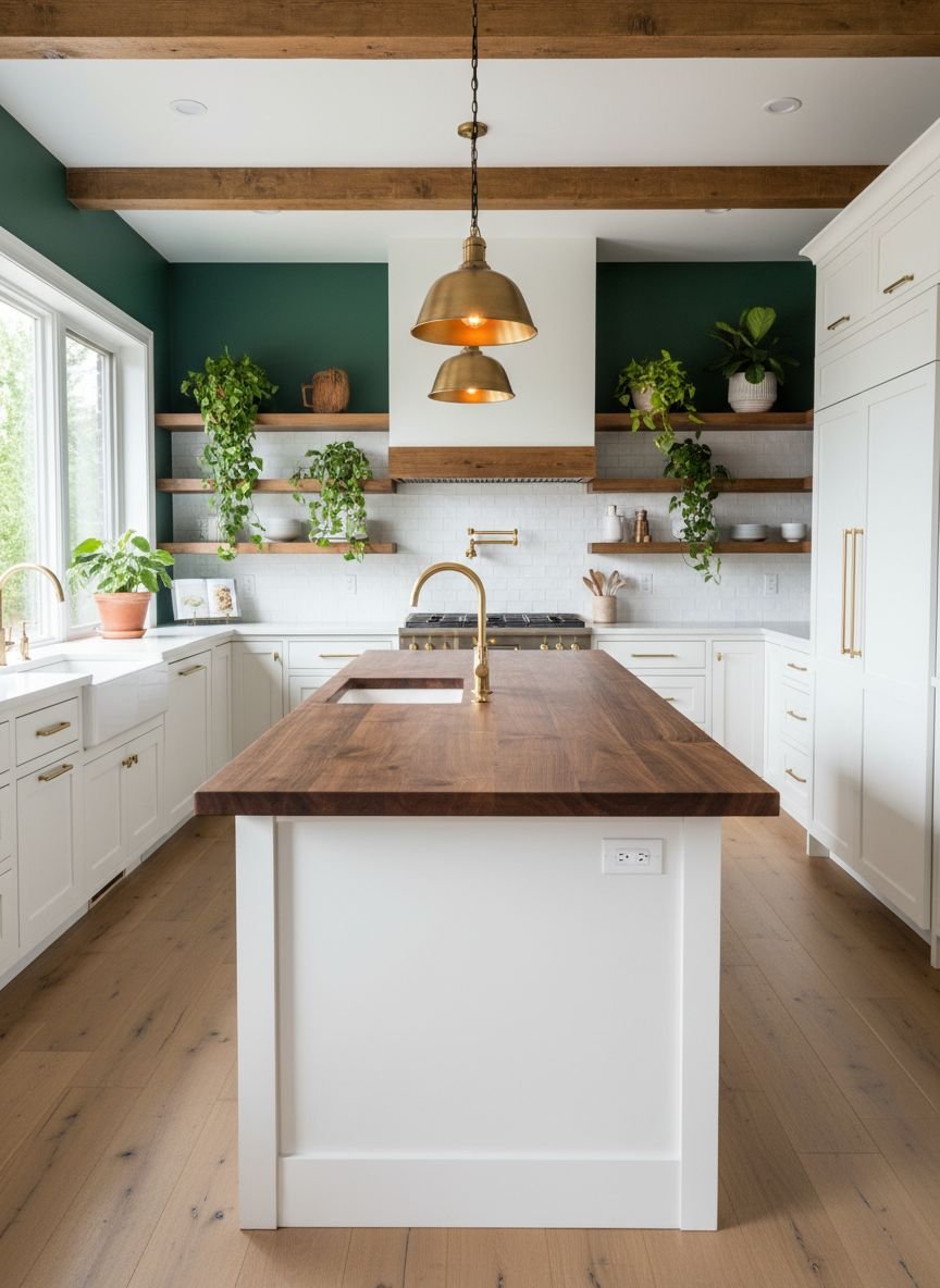 Two-toned cabinets are a practical solution for homeowners who want color but fear it might be overwhelming. A popular configuration is painting the lower cabinets a deep green (like moss or forest) and keeping the upper walls white or neutral. Adding thick wooden open shelving bridges the gap between the two zones.