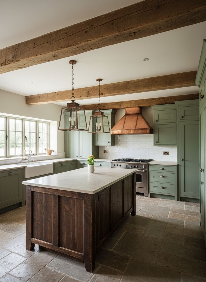 This design channels the “Cottagecore” aesthetic that has taken social media by storm. Soft, pastel green beadboard or shiplap paneling brings a quaint, nostalgic feel. When paired with rustic, weathered wood ceiling beams, the kitchen feels like a centuries-old farmhouse.