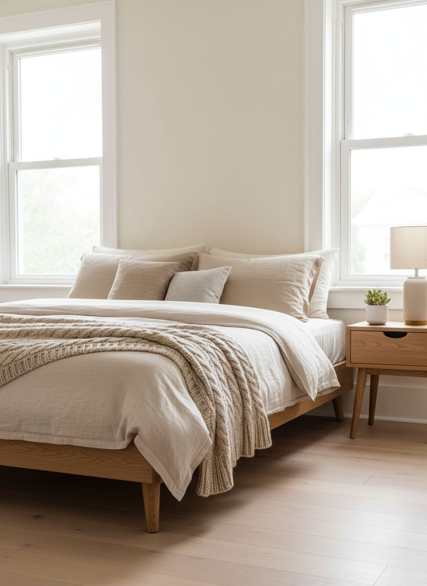 Simply grounded blends Japanese rustic minimalism with Scandinavian functionality (Japandi). The focus is on low-profile furniture. A low platform bed connects you to the earth. The color palette is warm neutrals: oatmeal, cream, and stone. Materials are raw and honest. Unfinished wood, stone, and bamboo are common. The lines are clean but the edges are soft.