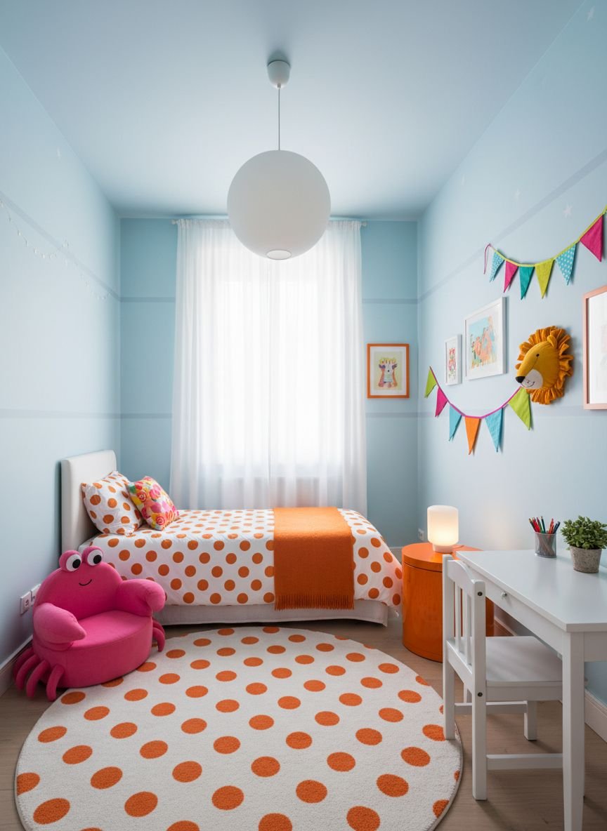 A colorful youthful space energizes and inspires. This design is not just for teenagers. Adults who love dopamine decor thrive here. High-saturation colors create a vibrant atmosphere. Mix complementary colors like blue and orange for dynamic contrast. Geometric patterns on rugs or wallpaper add movement. The furniture can be playful. Think acrylic chairs or painted wood frames.