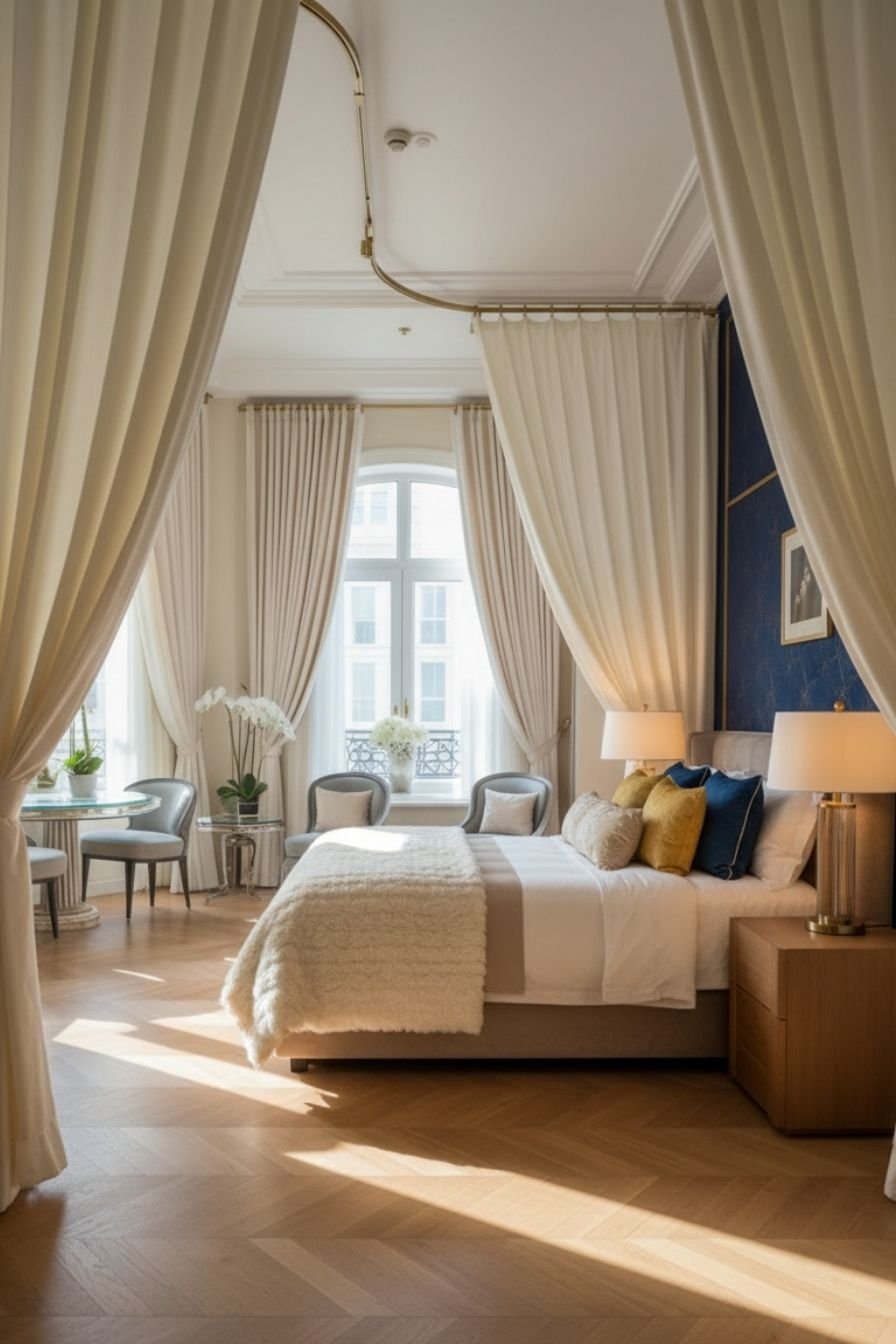 Lighting should be layered and adjustable. Install dimmer switches to control the ambiance. A statement chandelier adds a focal point of luxury. Heavy blackout curtains ensure deep sleep and add dramatic texture to the windows. Keep personal clutter hidden. The goal is a serene and polished environment. Use trays to corral small items like jewelry or water carafes. Every element should feel intentional and curated.