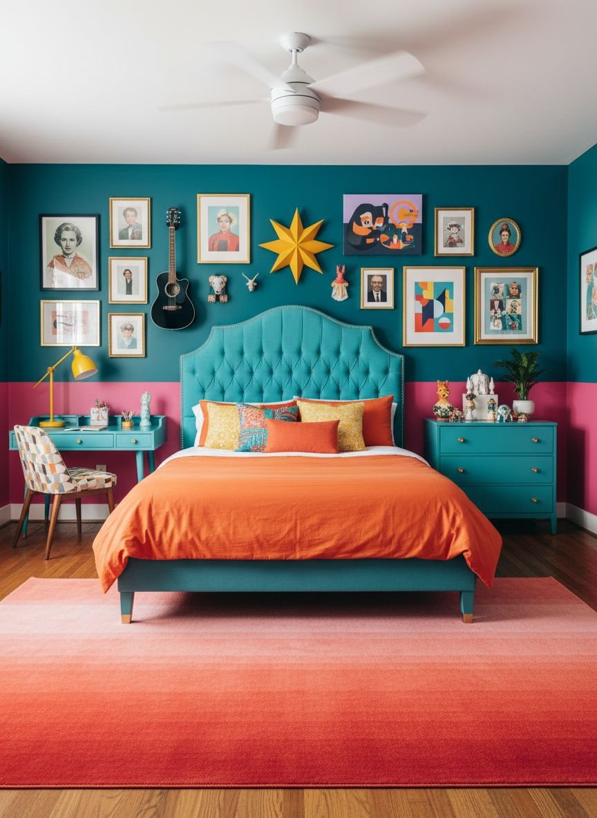 Personality shines in a room with eclectic retro vibes. This style mixes eras and textures fearlessly. Mid-century modern furniture pairs with 70s-inspired patterns. Bold colors like mustard yellow, burnt orange, and teal take center stage. Velvet headboards add a touch of vintage glamour. Rattan accents bring in natural warmth. The key is controlled chaos. A unifying color thread connects the disparate elements.