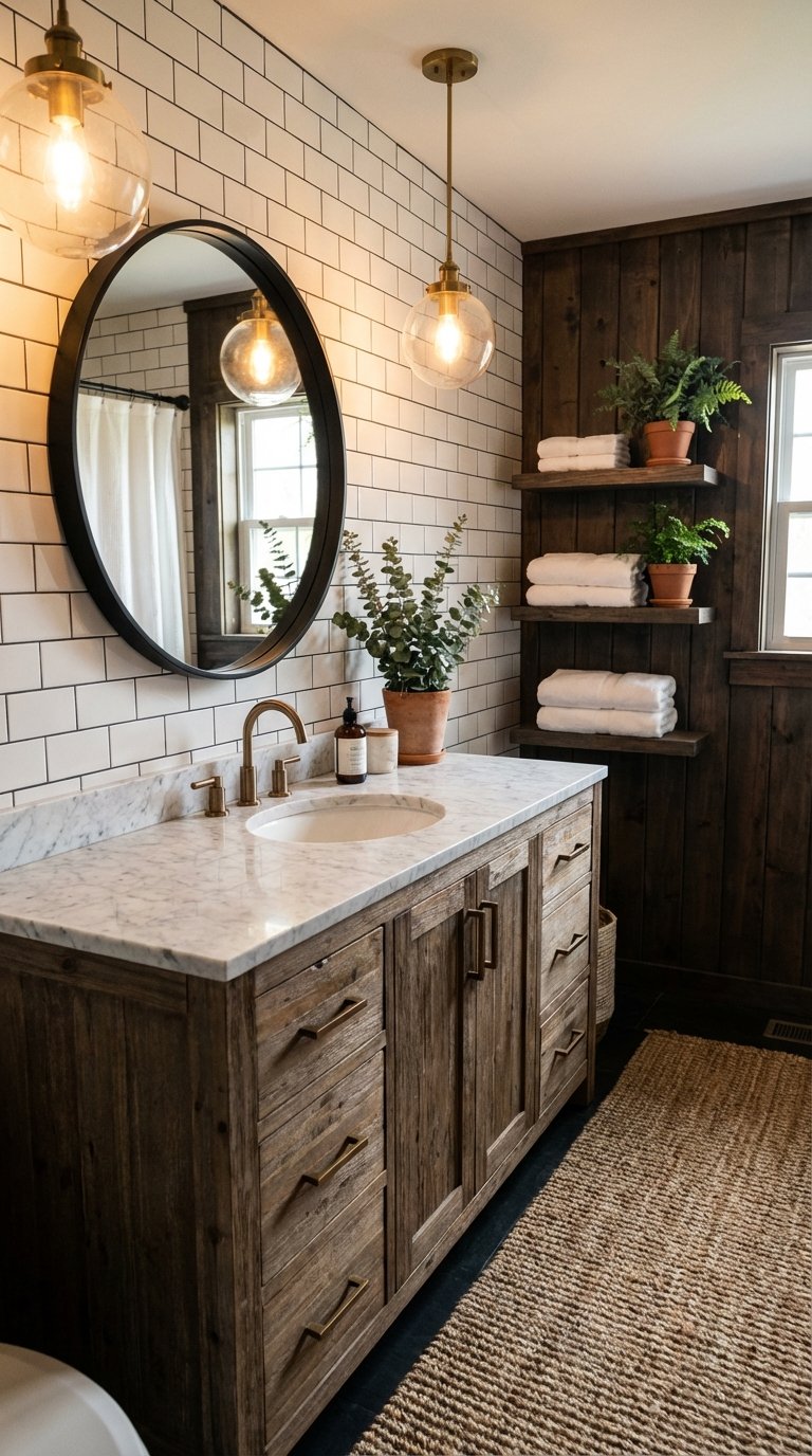 You can achieve a 2026 look by swapping out hardware and lighting. changing chrome faucets to brushed brass, replacing a standard mirror with an organic-shaped or backlit mirror, and painting the vanity a sage green or warm beige can completely transform the room. Adding “spa” accessories like a wooden stool, a high-quality bath mat, and a plant can also modernize the vibe instantly.