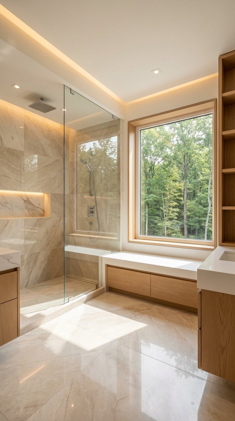 - The “Spa-throom” Evolution: Features like steam showers, curved arches, and ambient lighting are now standard desires.