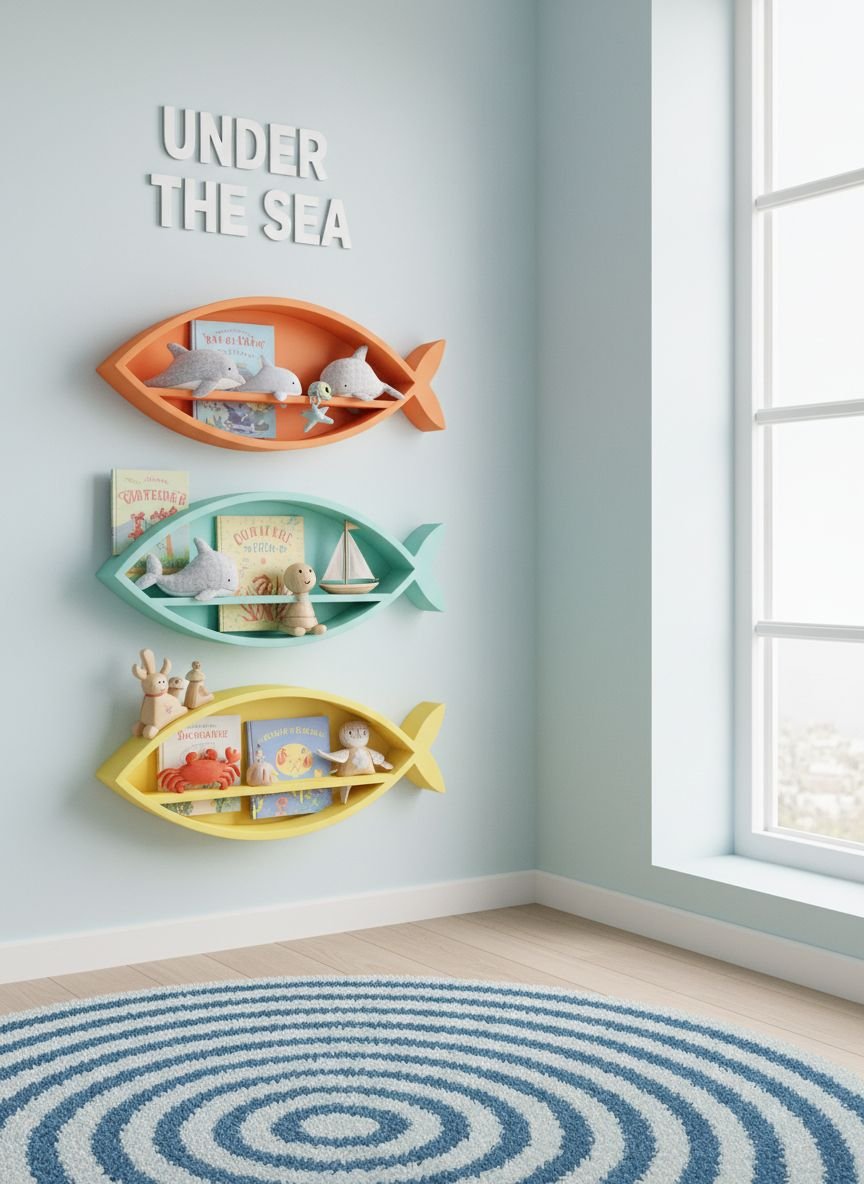 Themed rooms are huge for kids, and an ocean theme offers cool blues and greens that are calming yet bright. Look for corner shelves shaped like waves, whales, or coral reefs. A “wave” shelf with a scalloped front edge adds movement and mimics the ocean surface. Styling these with sea-glass tones, shell collections, or marine animal figurines creates a cohesive underwater world.