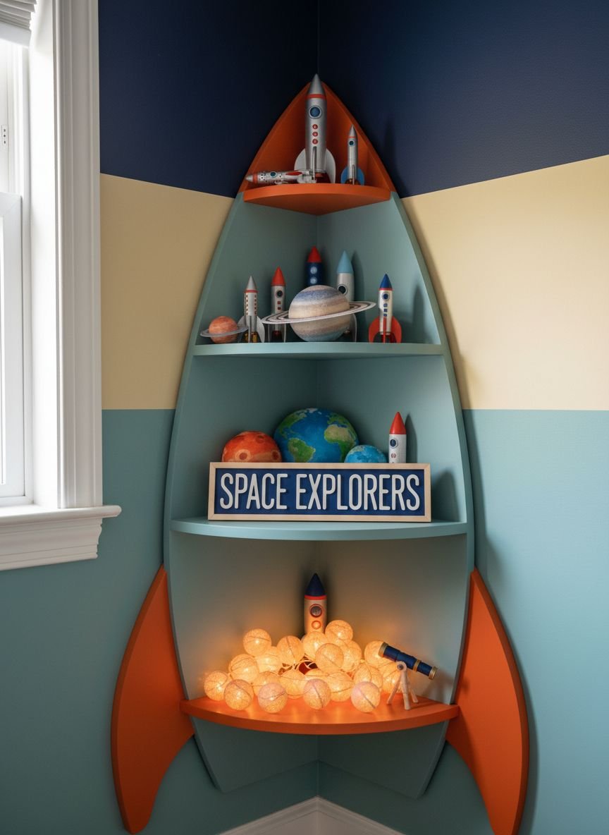 For the little astronaut, a dark corner can become deep space. Use black or dark blue shelves and decorate the surrounding wall with glow-in-the-dark stars. Rocket-shaped tall corner units are also popular, where the nose cone fits into the top corner and the shelves are the body of the ship. This encourages imaginative play and interest in science.