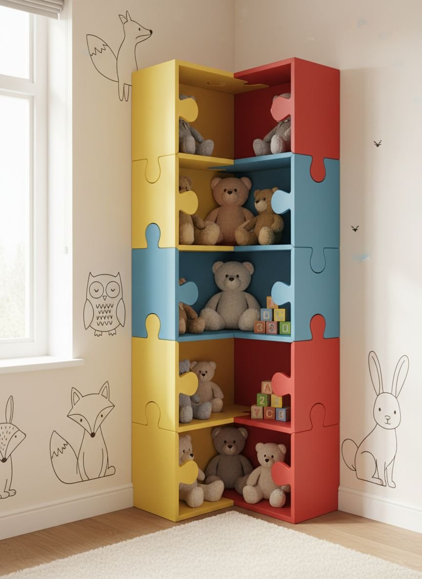 For a truly unique and playful look, opt for shelves cut into jigsaw puzzle shapes that interlock or look like they are about to. These can be painted in bright, contrasting colors like cyan, magenta, and lime green. The “knobs” and “holes” of the puzzle shapes can even serve as functional hooks for hanging bags or dress-up clothes.