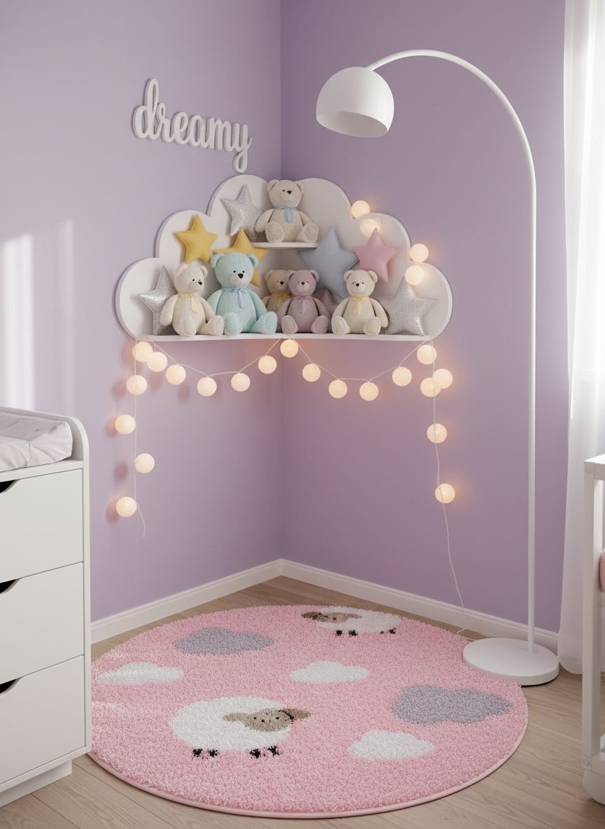 Pro Tip: Paint the wall behind the shelves a soft sky blue or apply star decals to complete the atmospheric look.