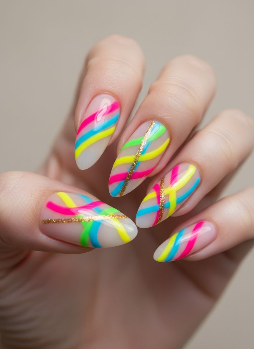 To achieve this look, you need a makeup sponge and high-pigment polishes. You paint stripes of your chosen colors onto the sponge and dab it repeatedly onto the nail. The porous texture of the sponge blends the wet polish for a soft transition. You must apply a white base coat first. The white background makes the neon pigments appear true to color rather than translucent. Finish with a glossy top coat to smooth out the texture left by the sponge.