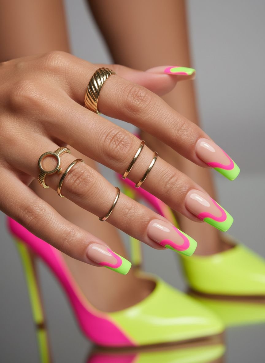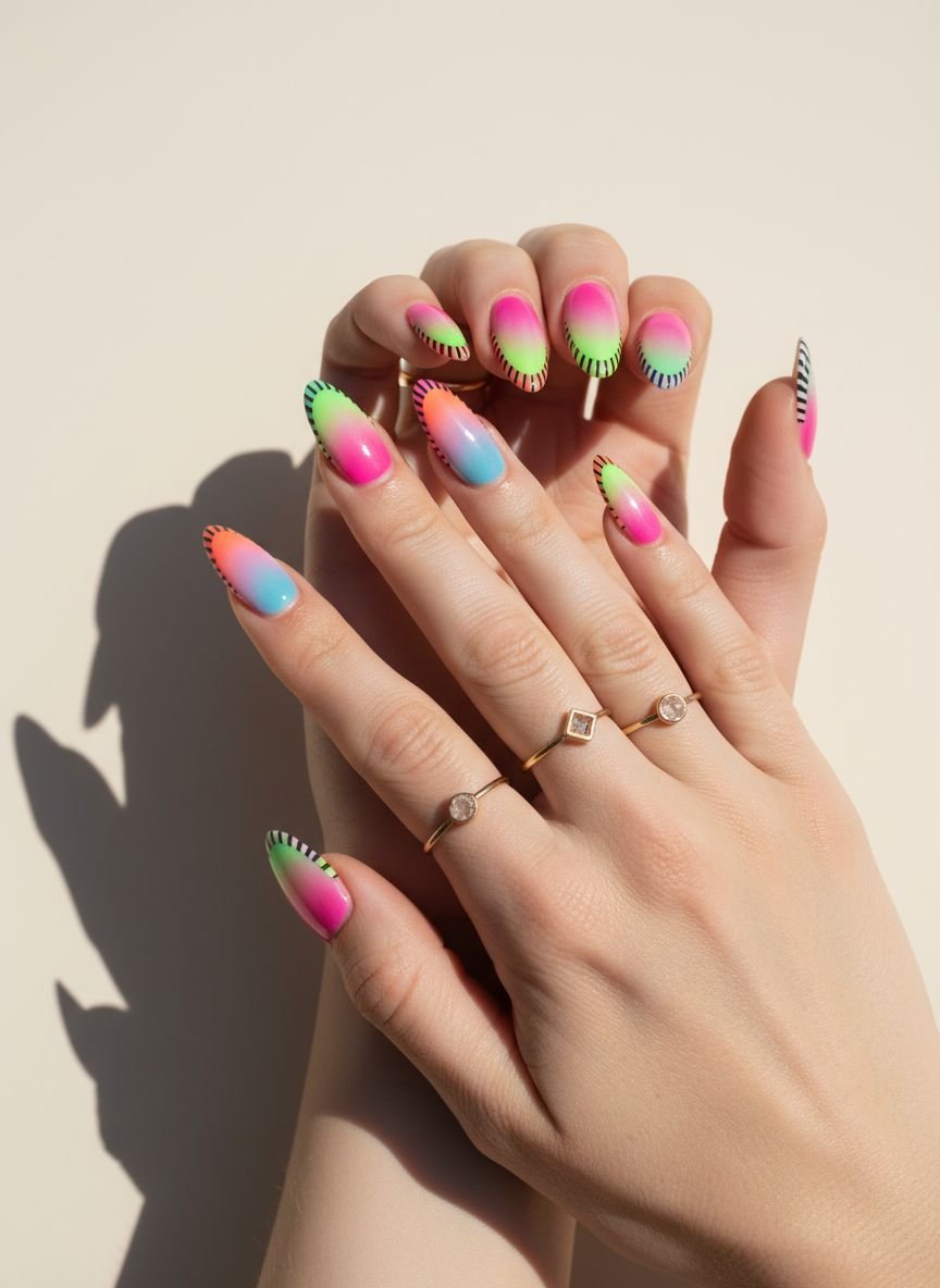 Nothing screams summer festival quite like a blindingly bright gradient. Neon ombre combines two or more electric shades that fade seamlessly into one another. The most popular combinations often involve hot pink melting into tangerine orange, or lime green fading into electric blue. This style mimics the intensity of stage lights and sunset skies. It offers a high-contrast look that pops against denim shorts and white crochet tops.