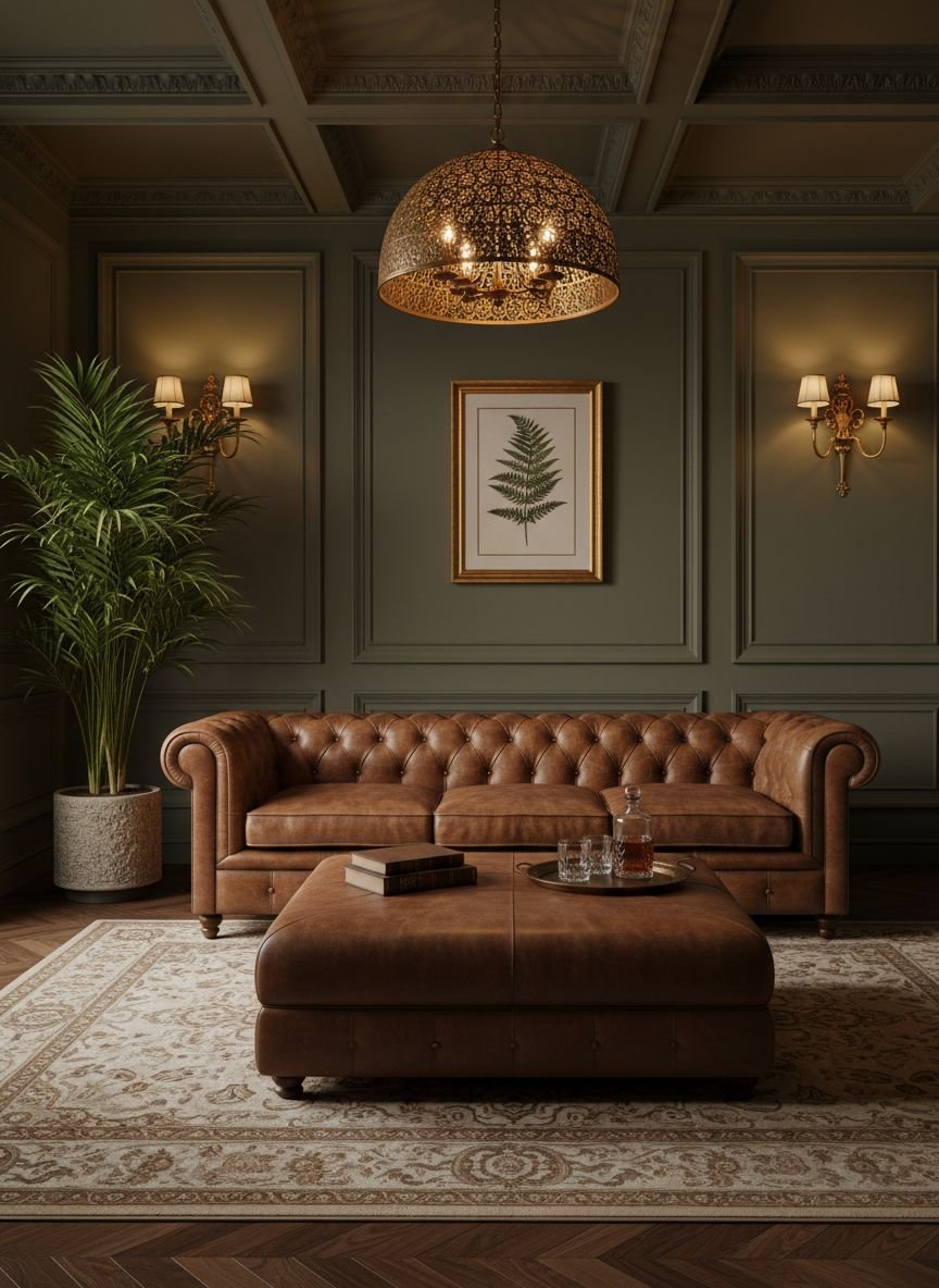 Nothing evokes masculine chic and the comfort of a revisited English club better than the mix of sage green and brown leather. Leather, in cognac, camel, or chocolate brown, brings an earthy warmth that contrasts beautifully with the coolness of the green. It’s a rich, textured, and very welcoming combination.