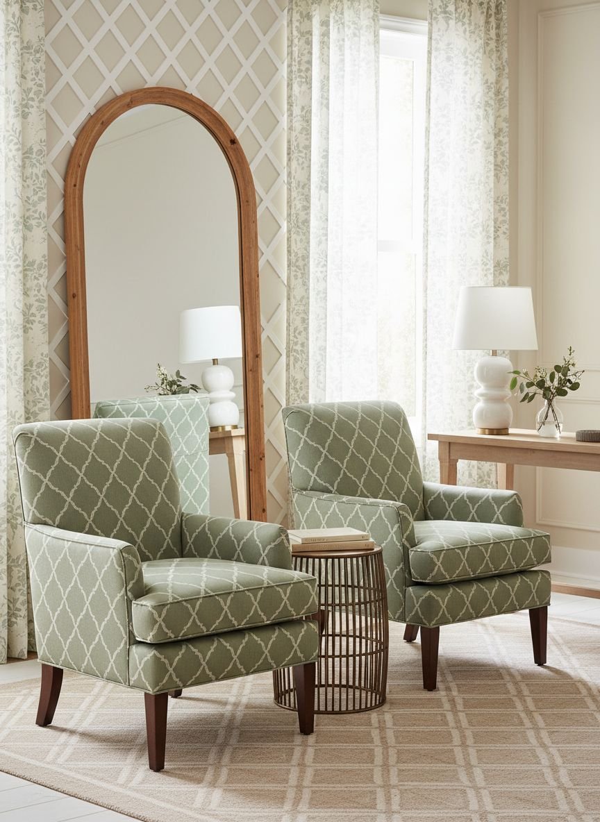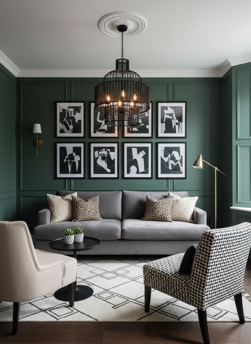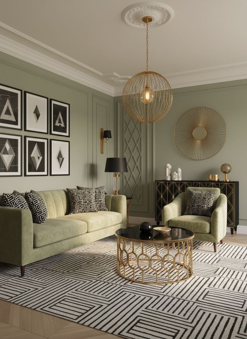 Imagine a checkerboard floor or a geometric black and white rug, sage green walls, and white furniture. Add thin black frames on the walls to structure the space. This is a very dynamic style, perfect for living rooms that are also thoroughfares or reception areas. Graphic patterns (stripes, chevrons) work very well in this palette.