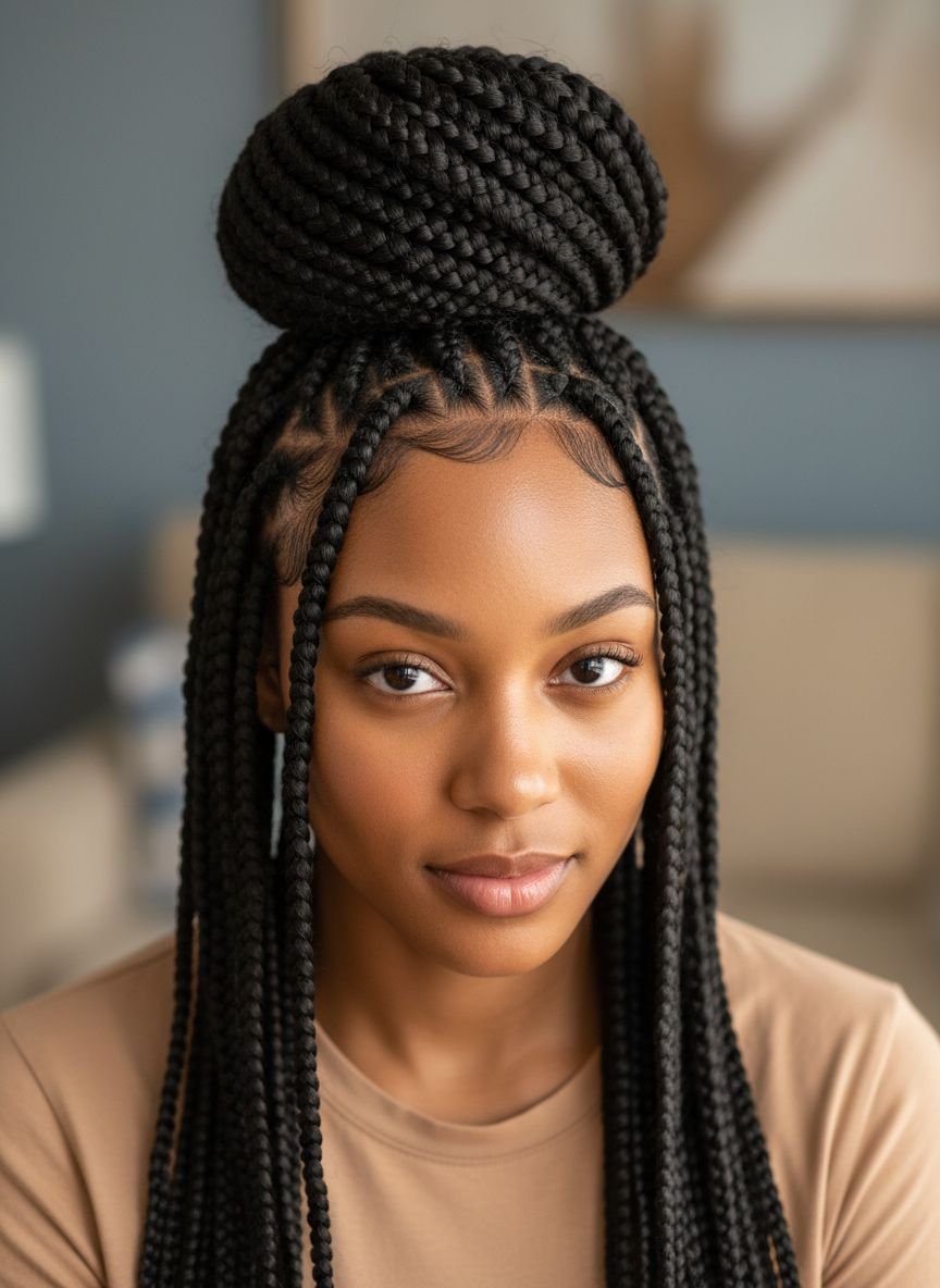 This is one of the most protective styles for the ends of your hair, as they are tucked away completely if you opt for a bun finish. It is also a quick install, often taking less than an hour. The challenge is keeping the part line crisp and the baby hairs laid. Since there are only two main braids, any frizz is more noticeable than in styles with many small braids.