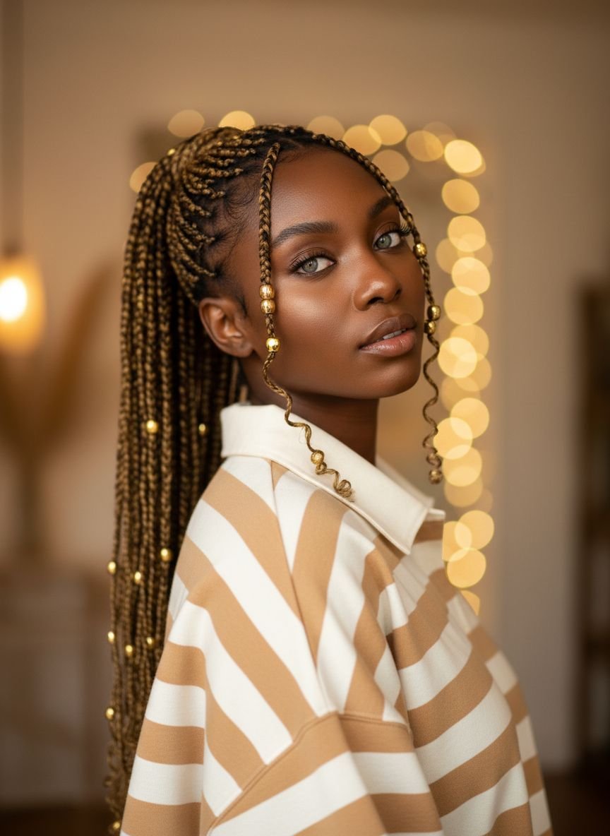 Inspired by Fulani culture, braids with beads are a timeless tradition that has returned to the forefront of fashion. This style typically features a mix of cornrows and individual braids, adorned with wooden, clear, or metallic beads at the ends. The beads add a kinetic element to the hairstyle—they click and sway as you move, adding both sound and visual interest.