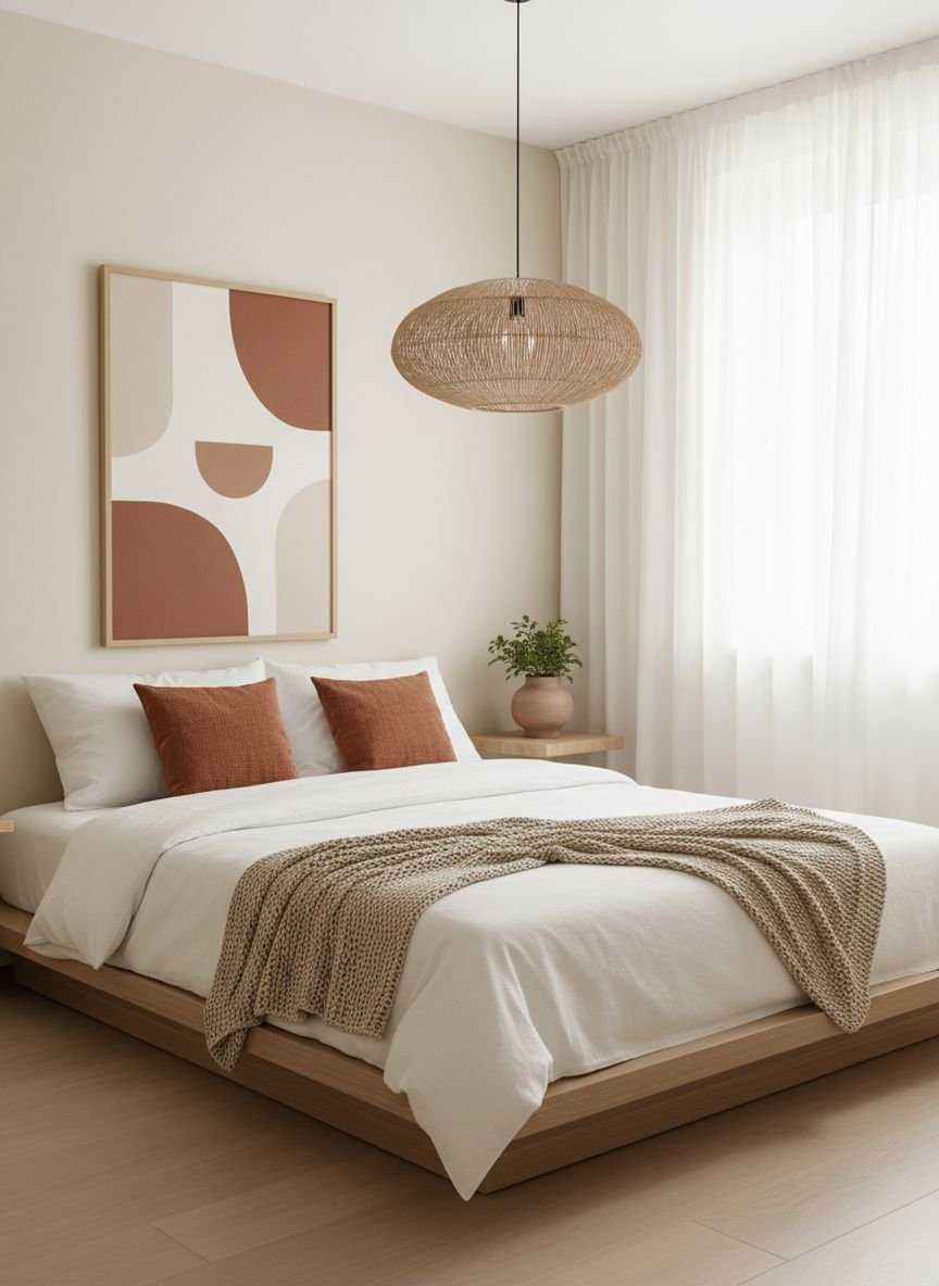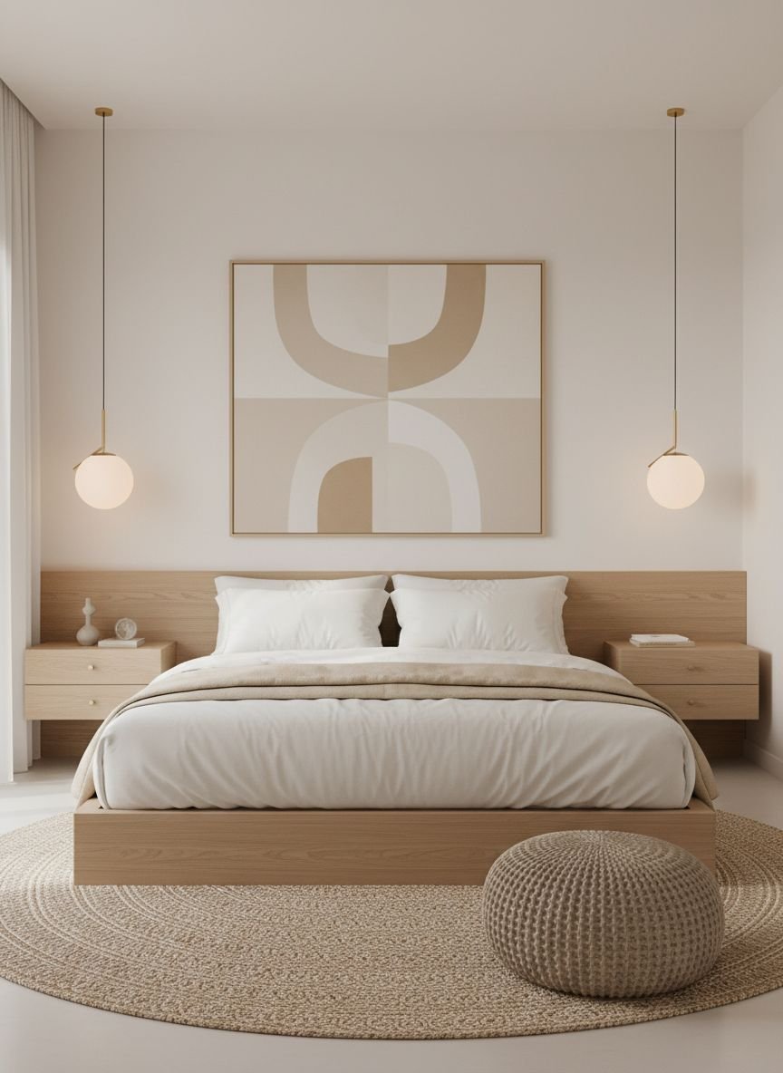 Beige has shed its reputation for being boring and has re-emerged as the champion of “Warm Minimalism.” A beige minimalist bedroom feels grounded, earthy, and incredibly cozy. It draws inspiration from nature—sand, wheat, dried grass—to create a space that feels organic. This is the ideal style for those who love the “Japandi” (Japanese + Scandinavian) aesthetic.