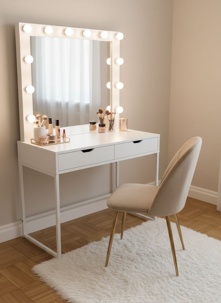 To prevent this look from feeling too “backstage,” the design integrates soft textures. A velvet tufted stool in a dusty rose or charcoal gray offsets the hard, shiny surfaces of the mirror and table. The juxtaposition of the industrial lighting with plush seating creates a balanced, high-end bedroom aesthetic. Keep the tabletop minimal; a single acrylic organizer for daily essentials ensures the lights remain the focal point.