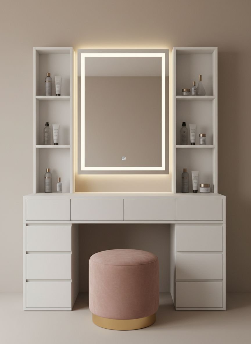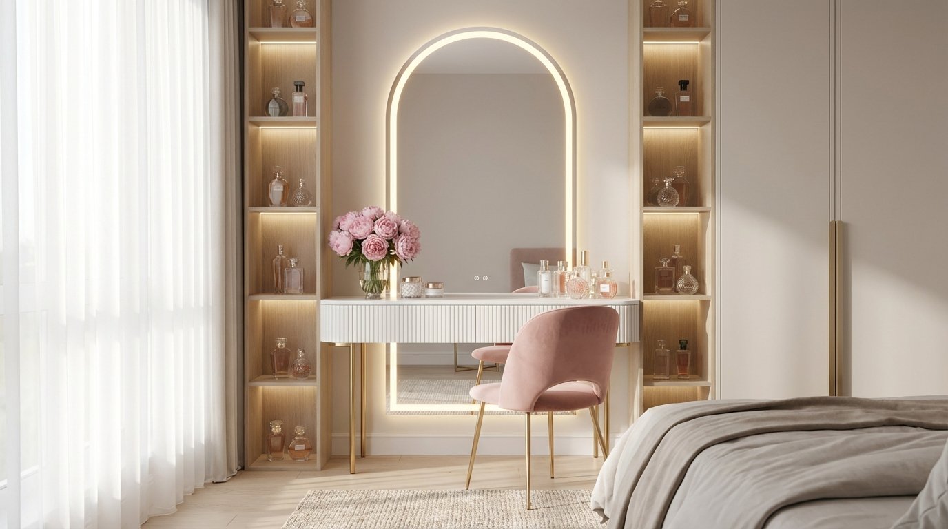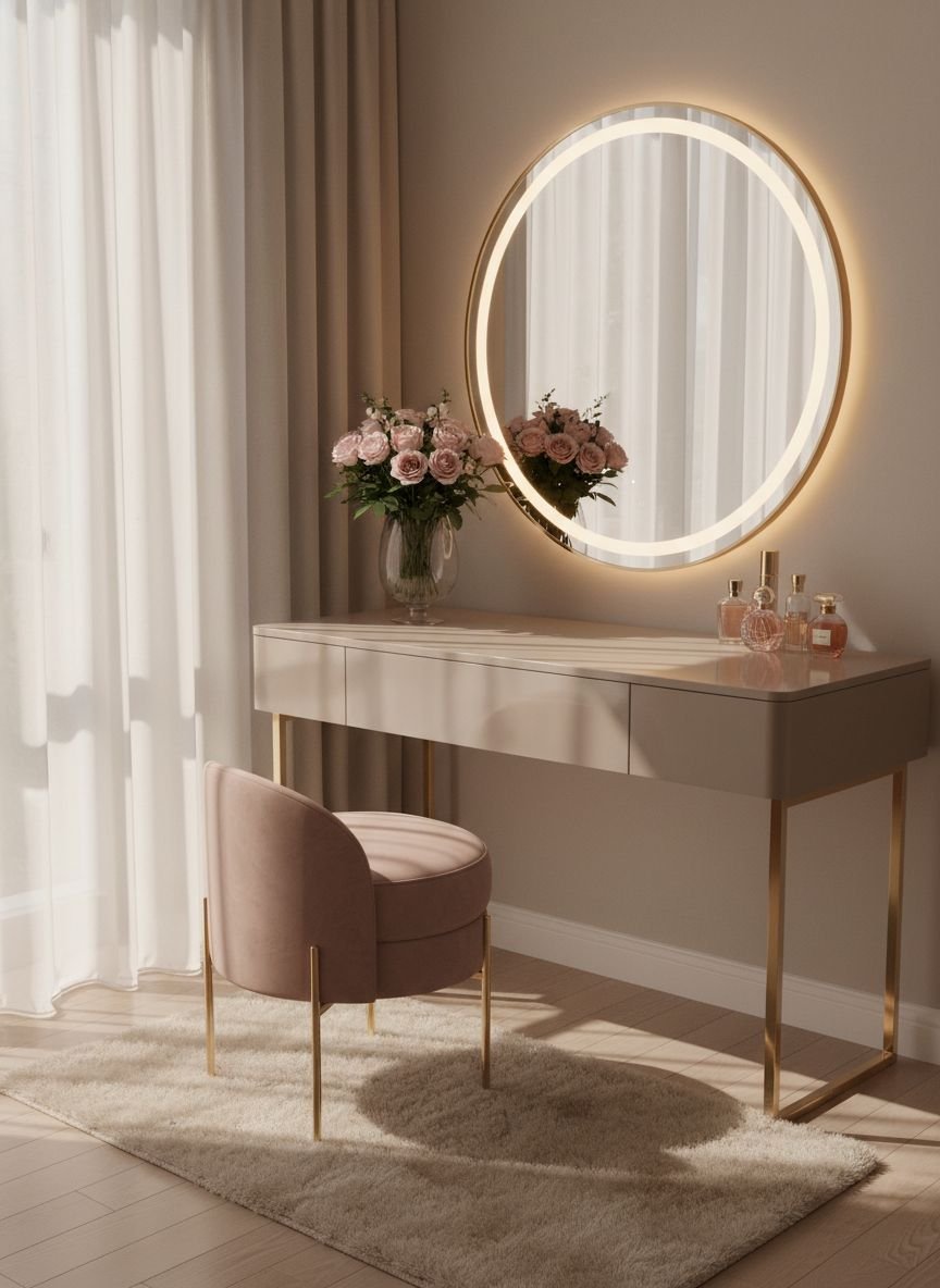 Ambiance is about how a space feels, not just how it looks. This dressing table concept focuses on mood lighting and tactile comfort. Instead of harsh task lighting, this setup uses warm, dimmable sconces placed at eye level on either side of the mirror. This “cross-lighting” technique flatters the face and creates a cozy atmosphere suitable for winding down at night.