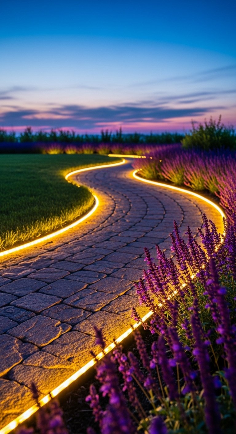 This is a very modern, clean look that works well with contemporary landscaping. It is also highly functional for safety, as it illuminates the entire length of the walkway, leaving no dark spots for tripping hazards. You can hide the rope light under the lip of a paver or bury it slightly in the mulch so that you only see the glow, not the plastic tube itself.