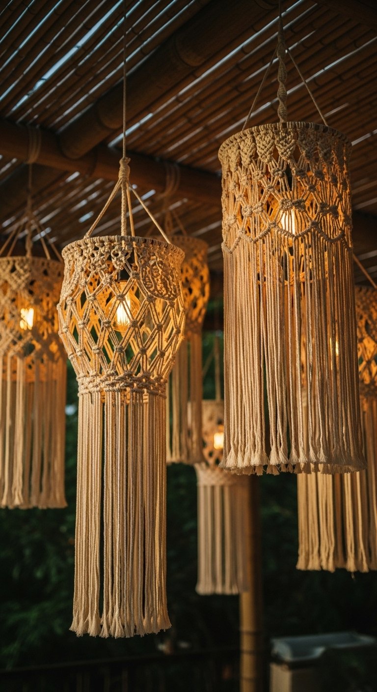 These lanterns are perfect for creating a “chill zone” or reading nook. Pair them with low seating, outdoor rugs, and plenty of cushions. Since macramé is typically made of cotton, these are best used in covered areas or brought inside during heavy rain. However, many newer versions use synthetic, weather-resistant rope that mimics the look of natural cotton while withstanding the elements.