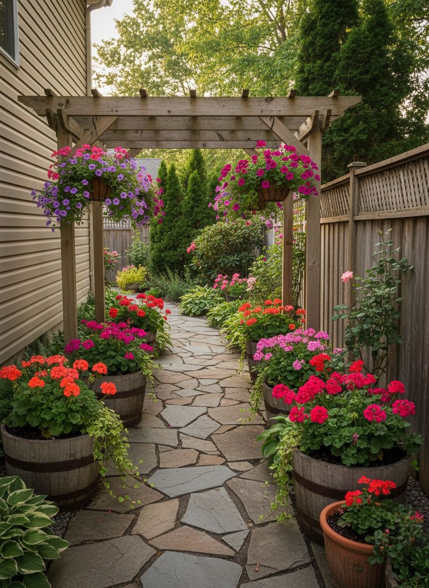 Hanging planters are essential for small backyard garden ideas you can easily create because they utilize the “air space” above your head. By suspending greenery, you keep the ground clear for furniture and foot traffic. A series of hanging baskets at different heights adds dynamic movement to a porch or pergola. As the wind blows, the gentle swaying of ferns or petunias adds a relaxing kinetic energy to the space.