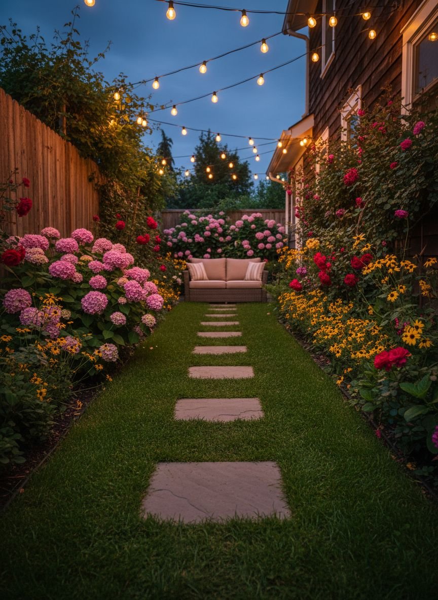 Lighting is the fastest way to extend the usability of your small backyard garden into the evening. String lights draped overhead create a “ceiling” that defines the outdoor room without closing it in. The warm glow of Edison bulbs mimics candlelight, making the space feel cozy and inviting. This lighting strategy eliminates harsh shadows and highlights the textures of your plants and hardscaping.