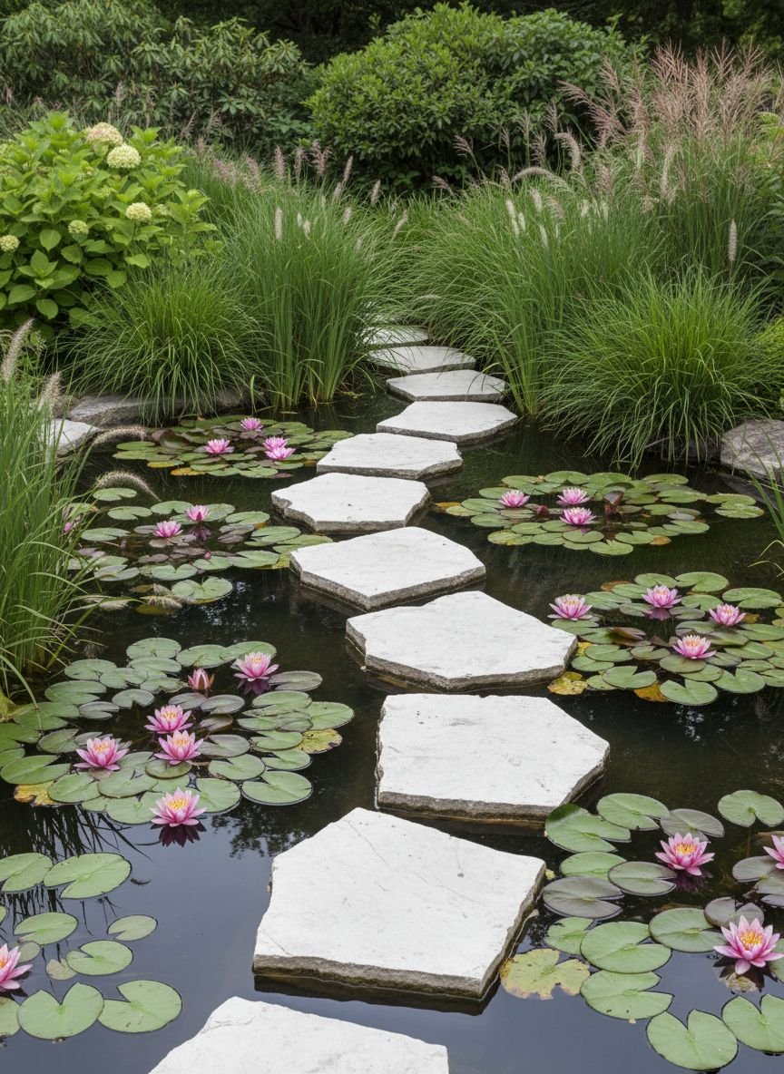 Courtyard pond with floating lilies and sculptural stepping stones
