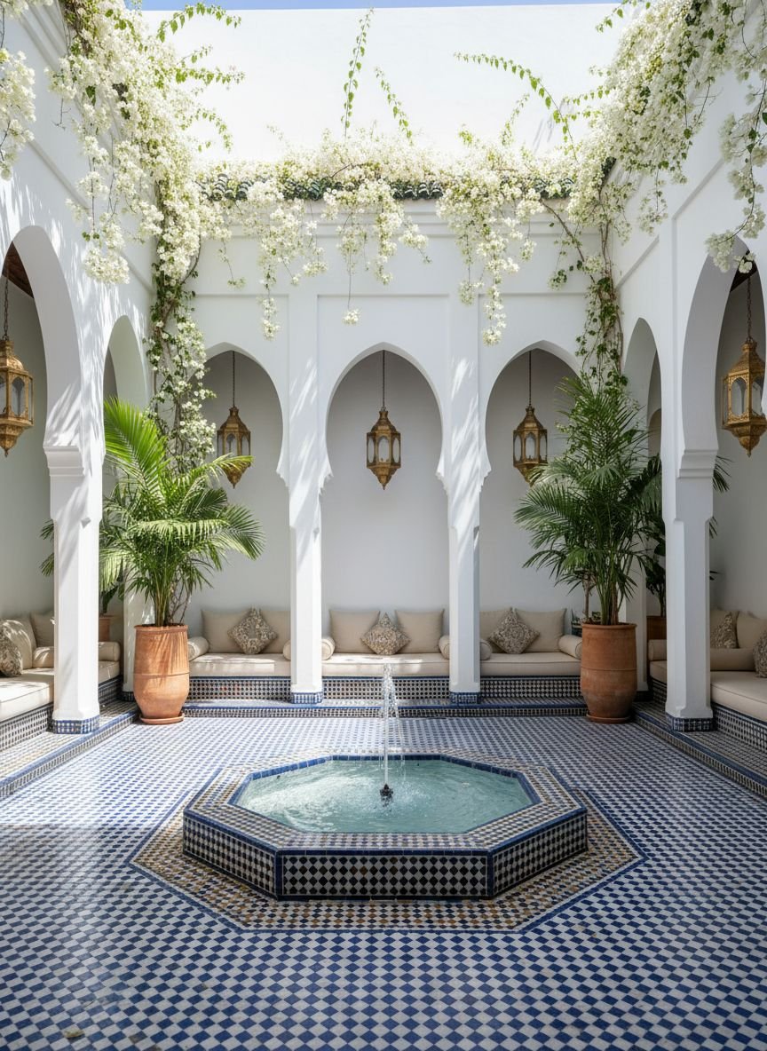 Inspired by the riads of Marrakesh, this design is about enclosure, privacy, and cooling water. The centerpiece is a wall fountain or central basin clad in zellige (patterned geometric tiles) in shades of turquoise, cobalt, and emerald. The sound of water is essential here.