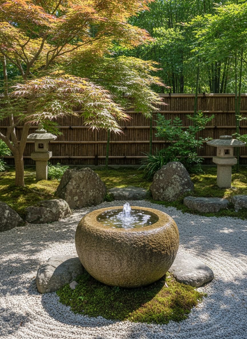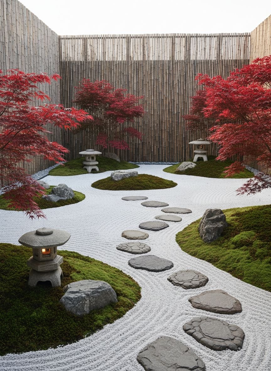 Japanese-inspired courtyard with raked gravel, moss islands, and stone lanterns