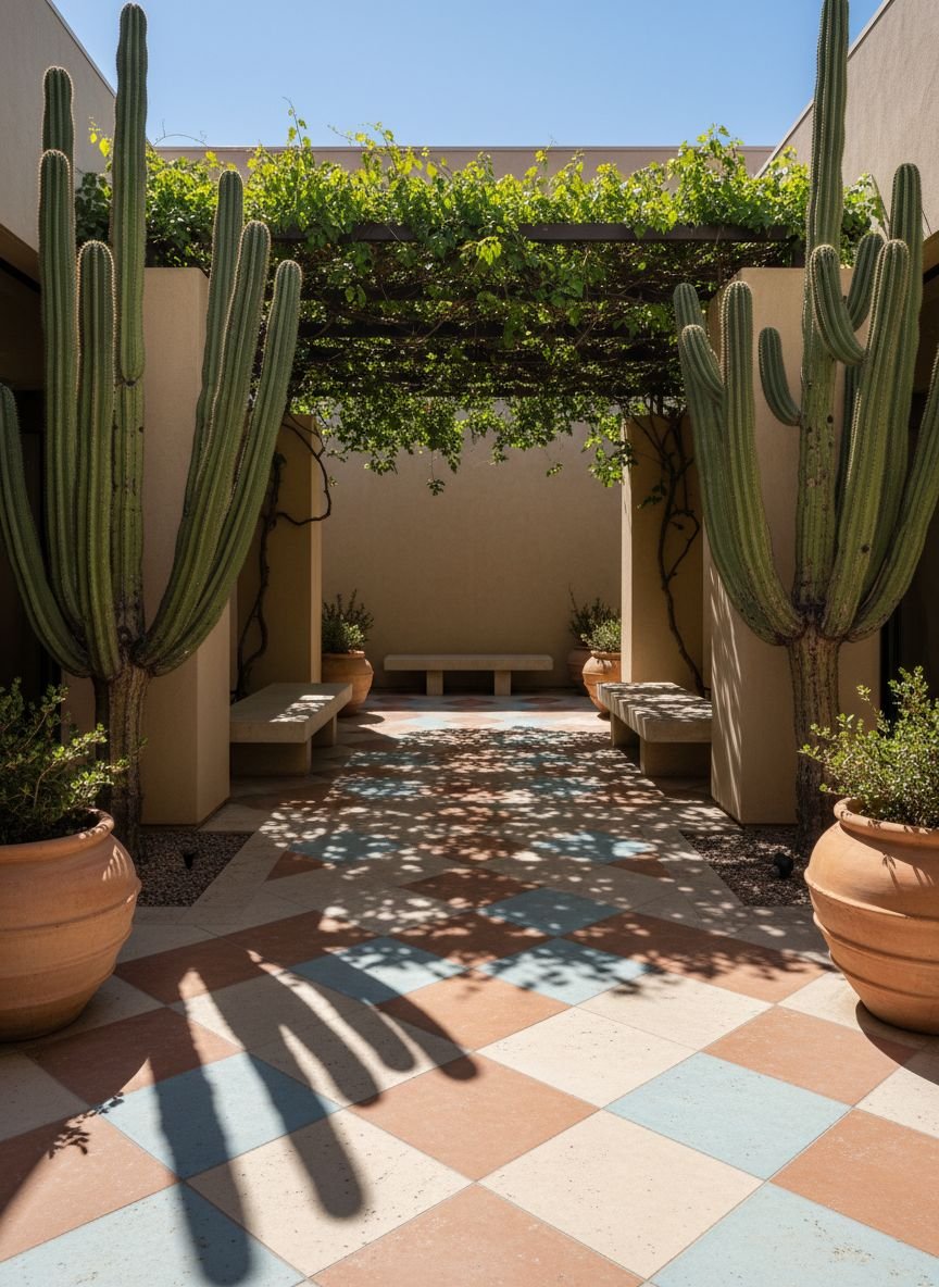 Sculptural cactus courtyard paired with patterned terracotta tile flooring