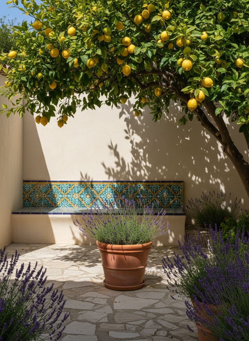Mediterranean courtyard with lemon trees, lavender borders, and mosaic benches