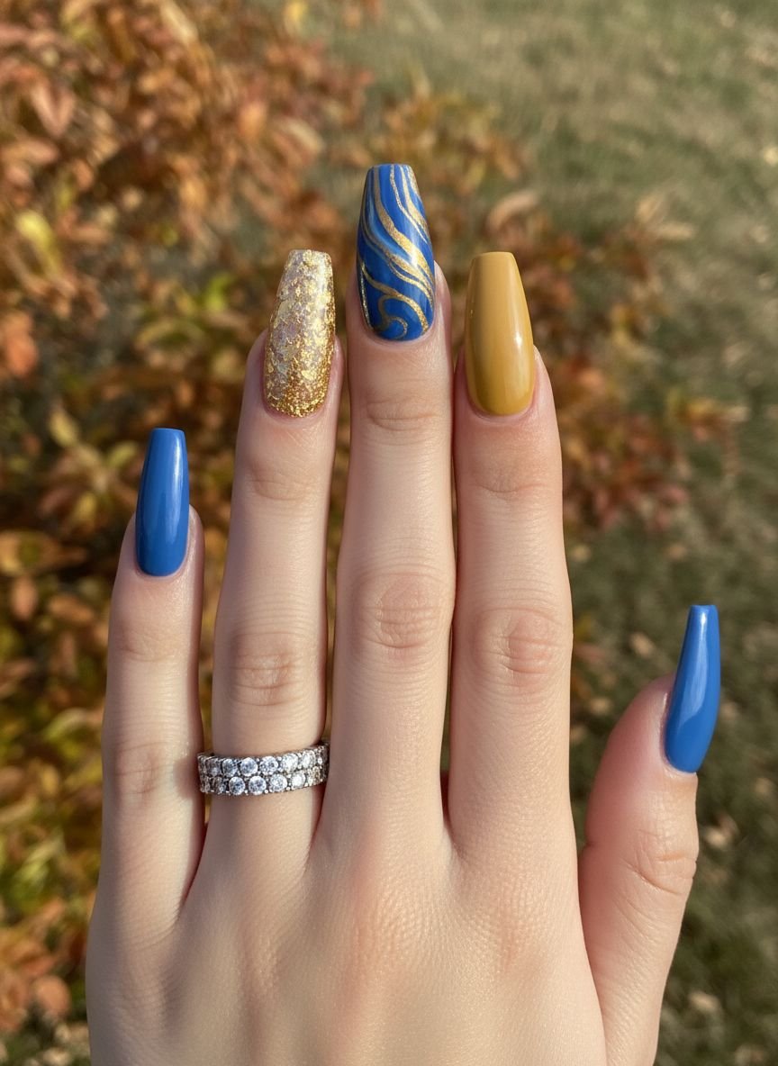 The transition from summer to autumn often starts with a shift in the warmth of your color palette. This design captures the essence of early September sunsets by combining mustard yellow with burnt orange. The look is energetic yet grounded, perfect for those who are not quite ready to commit to dark vampy colors just yet. The key here is to choose dusty, muted versions of these colors rather than bright primaries. Think turmeric and terracotta rather than crayon yellow and safety orange.