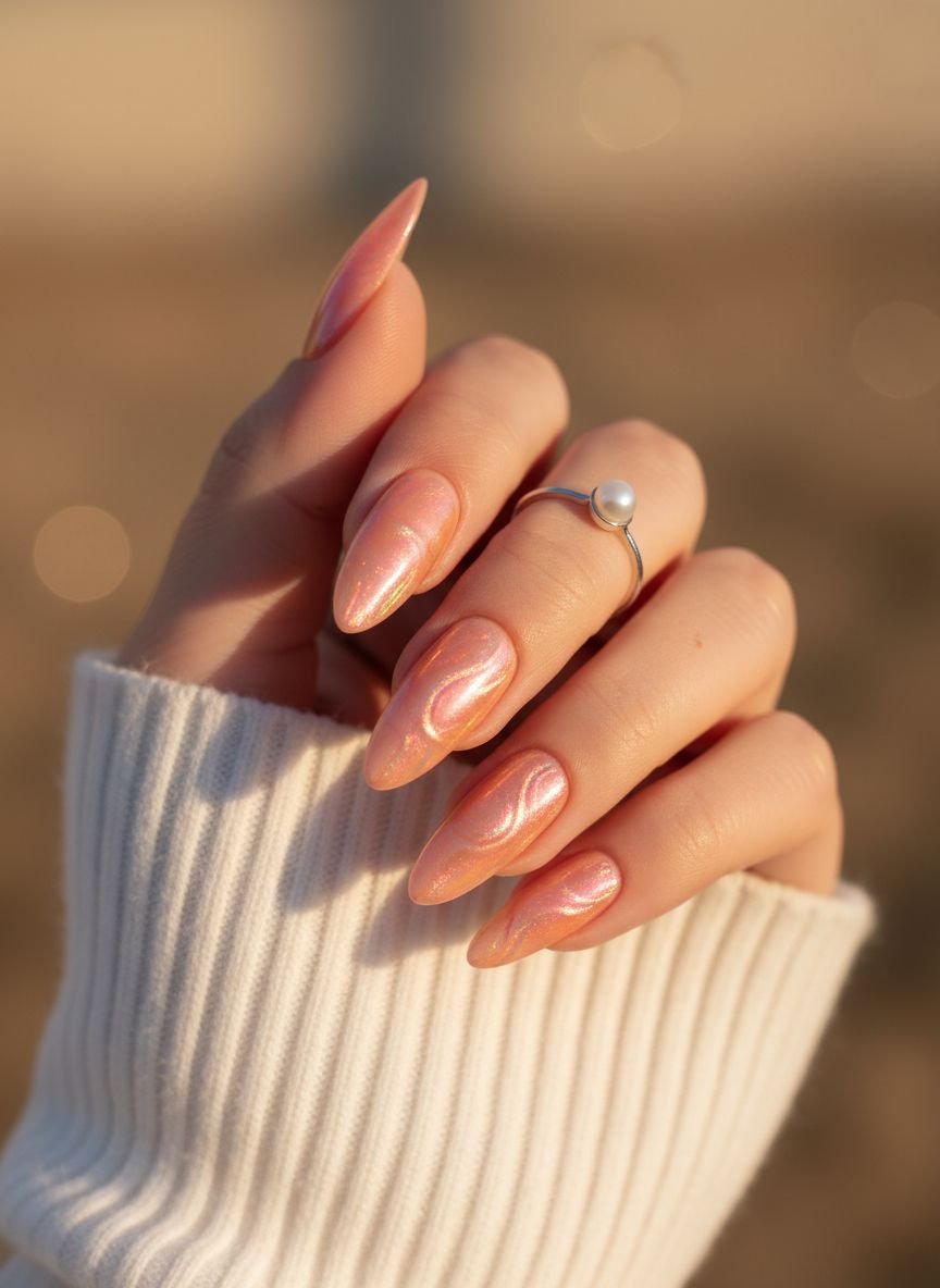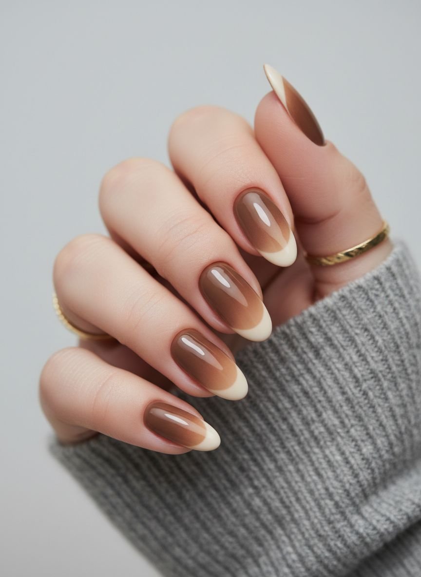 The viral “Glazed Donut” look has evolved for autumn. Instead of a white pearl finish, the trend for fall is a “Chocolate Glazed” look. This involves using a brown gel base color topped with a chrome powder to create a shimmering, delicious-looking finish that resembles a chocolate ganache.