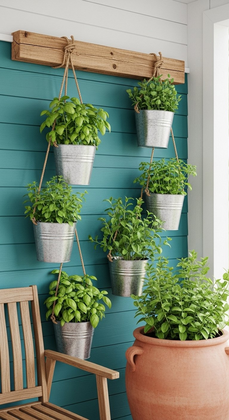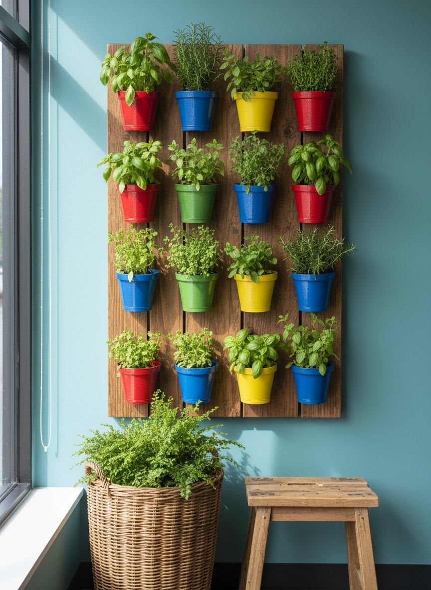 Mix and match colors for a bohemian vibe, or stick to a monochrome palette (like shades of blue) for a sophisticated look. Painted metal buckets or glazed ceramic pots work well here. The color contrast against the green herbs makes the plants pop visually.