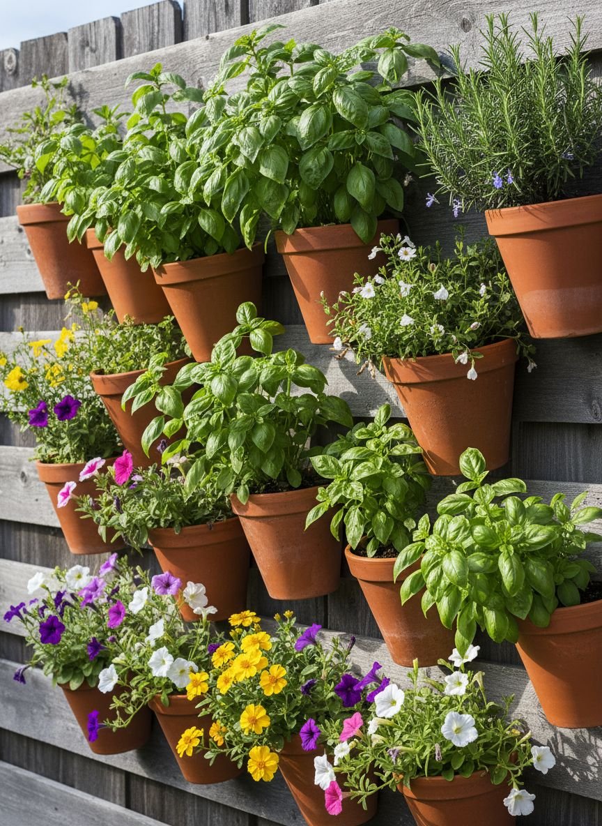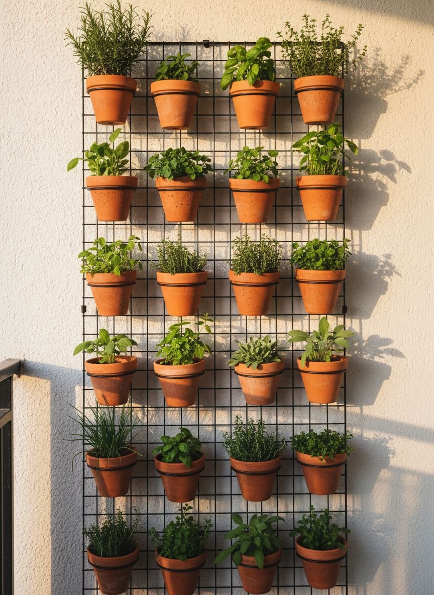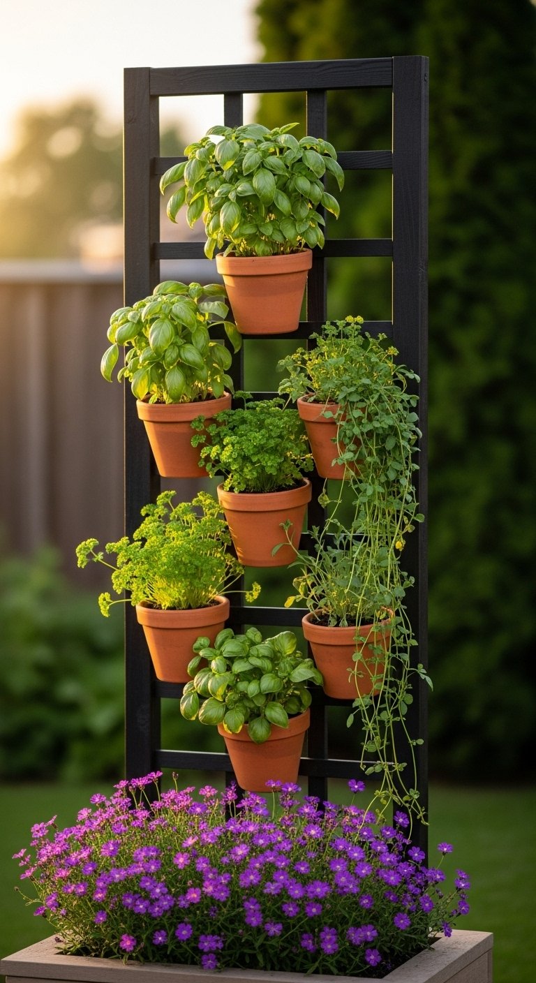 - Vertical Herb Garden with Clay Pots and Trellis