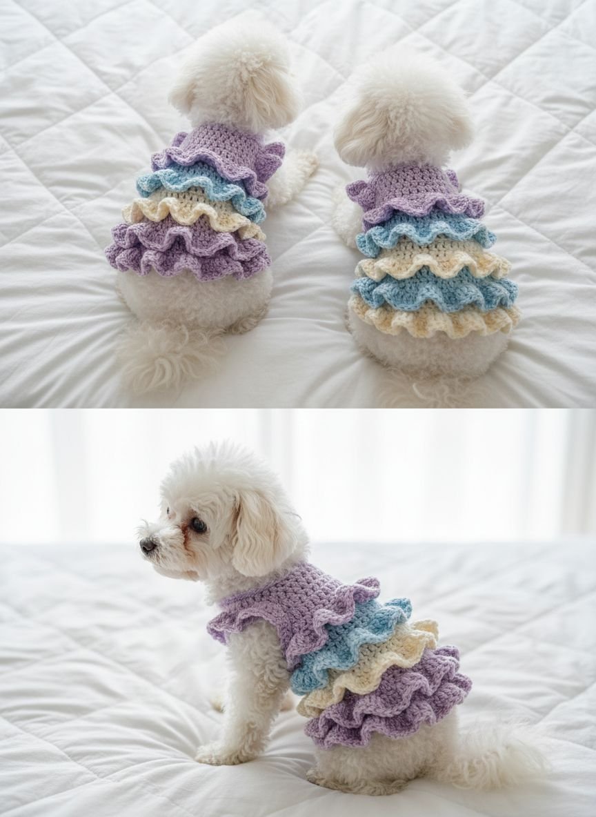 A variation of the jumper, this dress version adds a flirty ruffle at the bottom. It is perfect for indoor parties or mild spring days where full coverage isn’t necessary, but style is mandatory. The upper body remains snug and warm, protecting the vital organs, while the skirt adds a layer of cuteness that is undeniable. Many crafters make this for holiday photos or “Gotcha Day” celebrations. The stitch definition in the bodice contrasts beautifully with the flow of the skirt.