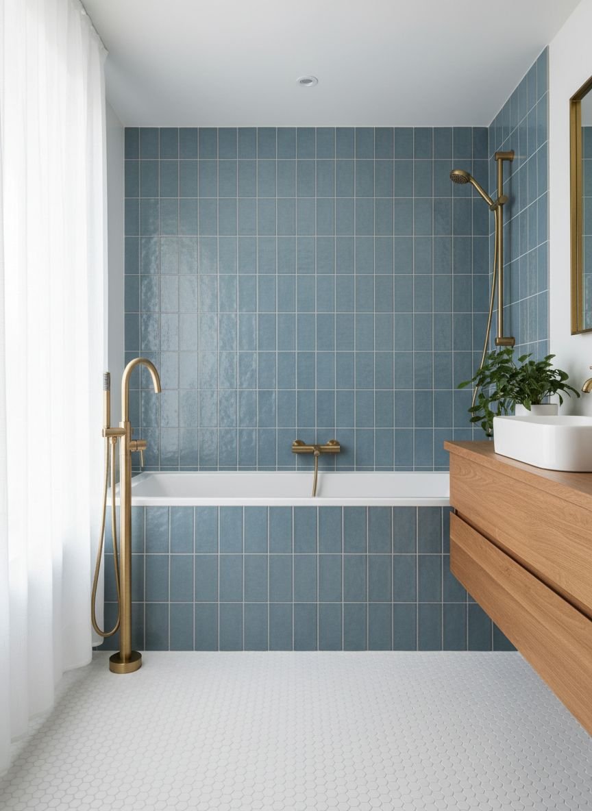 To enhance the serenity, pair these tiles with natural materials like a pebble floor or a wooden stool. The contrast between the cool blue and the warm, rough textures adds sophistication. This look is timeless; blue is a “neutral” in the world of bathroom design because it is so universally associated with water and cleanliness. It is a safe yet stylish bet for resale value.